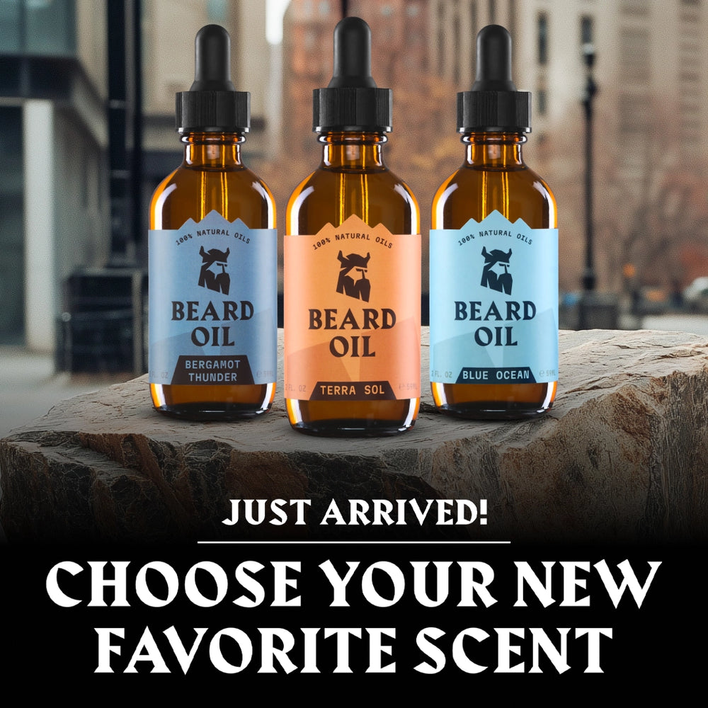 Discover Striking Viking’s three new premium beard oils — Bergamot Thunder, Terra Sol, and Blue Ocean. Crafted with natural oils to soften, condition, and hydrate your beard, these men’s grooming essentials reduce itch, promote healthy growth, and leave your beard soft, manageable, and irresistible. From bold citrus to earthy warmth and crisp ocean freshness, each scent delivers a signature style for every man. Shop Striking Viking Beard Oils Today — the ultimate choice for organic beard oils, natural beard care, and premium beard grooming.
