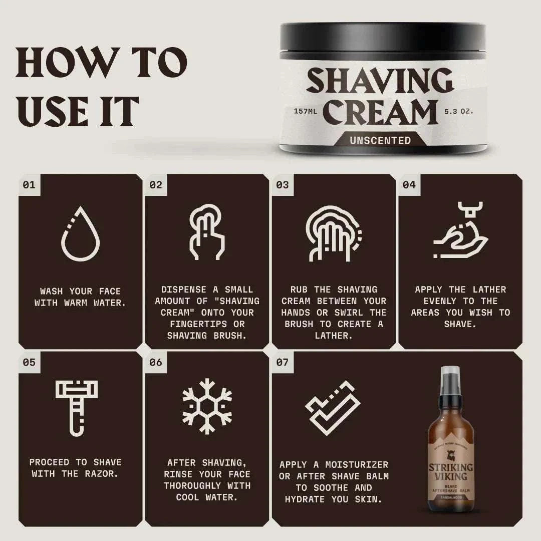 Step into the realm of superior grooming with Striking Viking Shaving Cream, designed to redefine the art of shaving. This unscented, professional-grade cream is a sanctuary for sensitive skin, offering a triumphant trifecta of moisturizing, protecting, and soothing. Its easy-to-lather formula promises not only a close, comfortable shave but also a safeguard against common shaving woes. Embrace this blend of functionality and elegance, as each shave leaves your skin feeling invigorated, fresh, and supremely smooth.