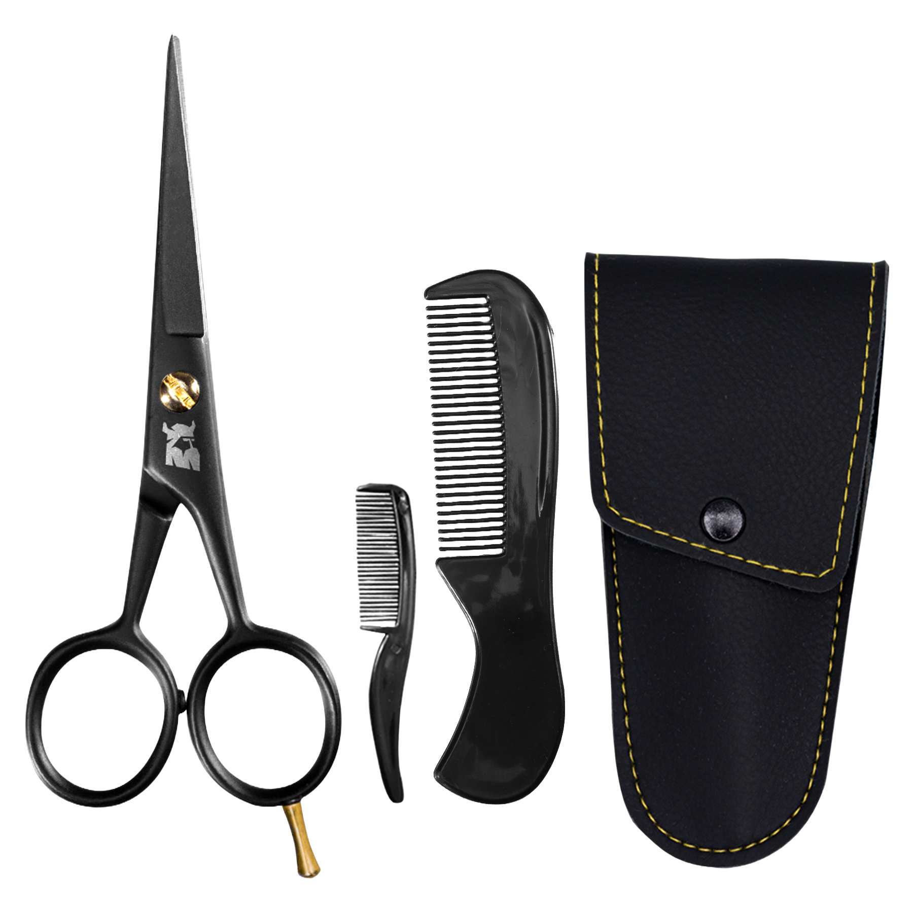 - Elevate Your Grooming Game with Striking Viking's Beard and Mustache Scissors Kit. Featuring sharp steel scissors, a synthetic leather carry case, a mini moustache comb, and a sleek aesthetic design
